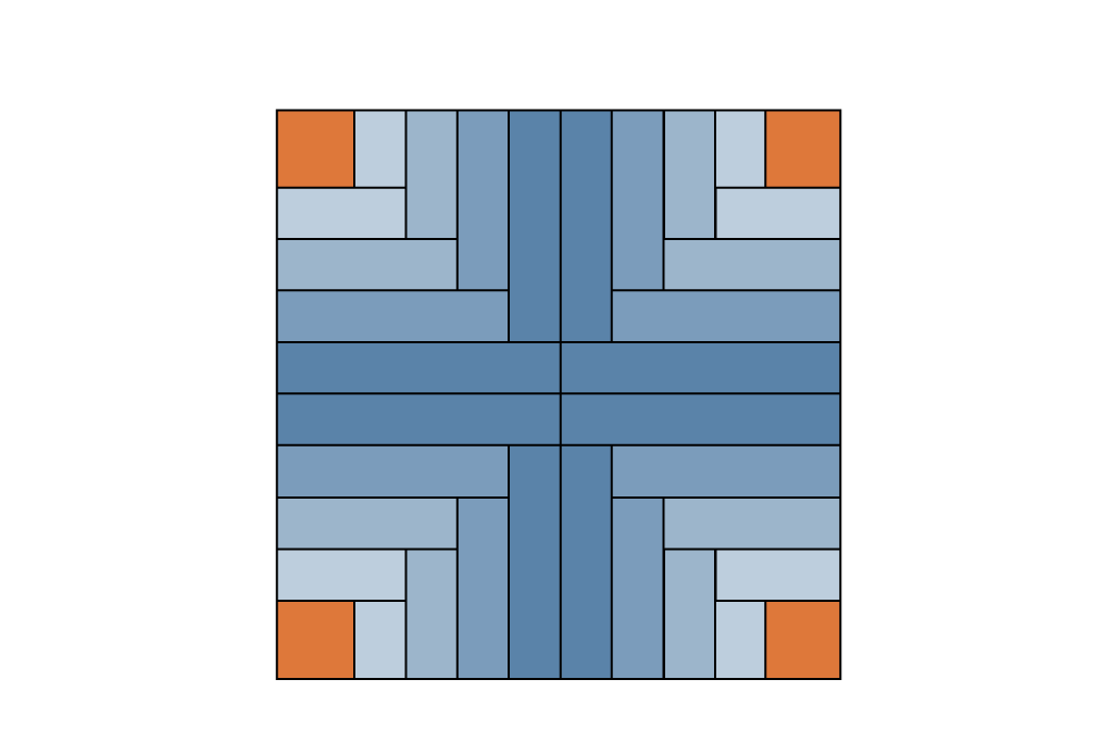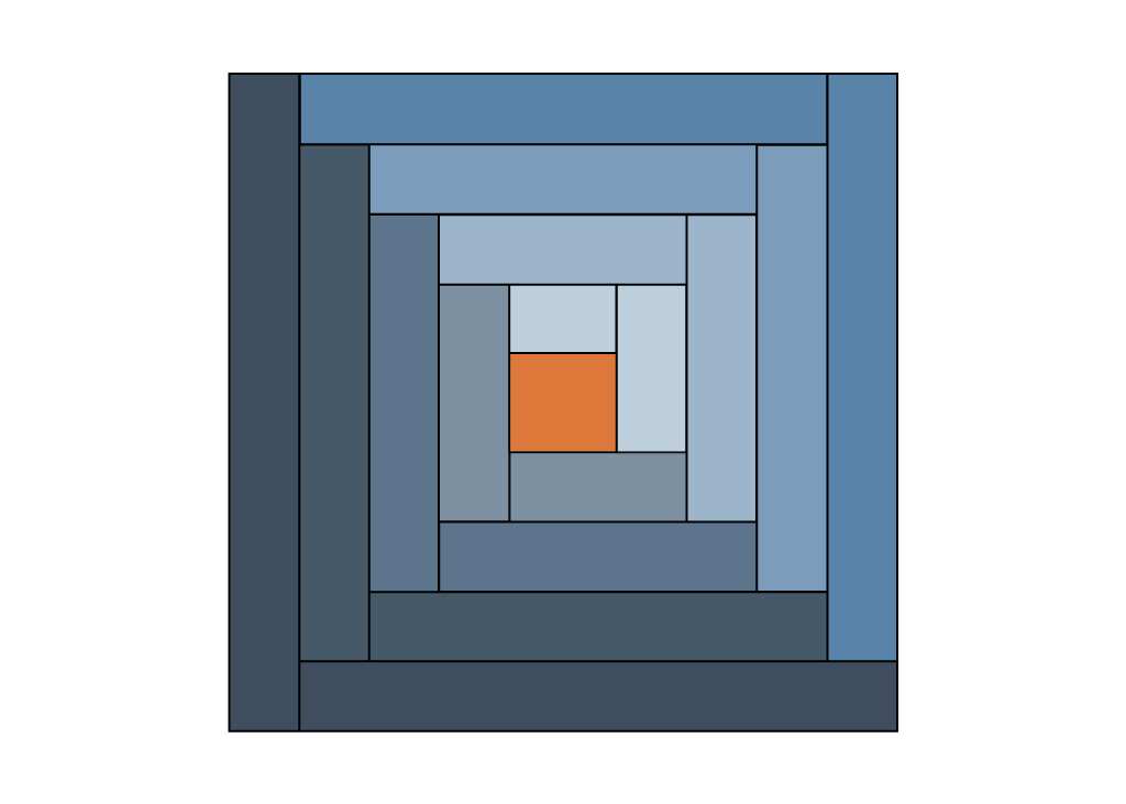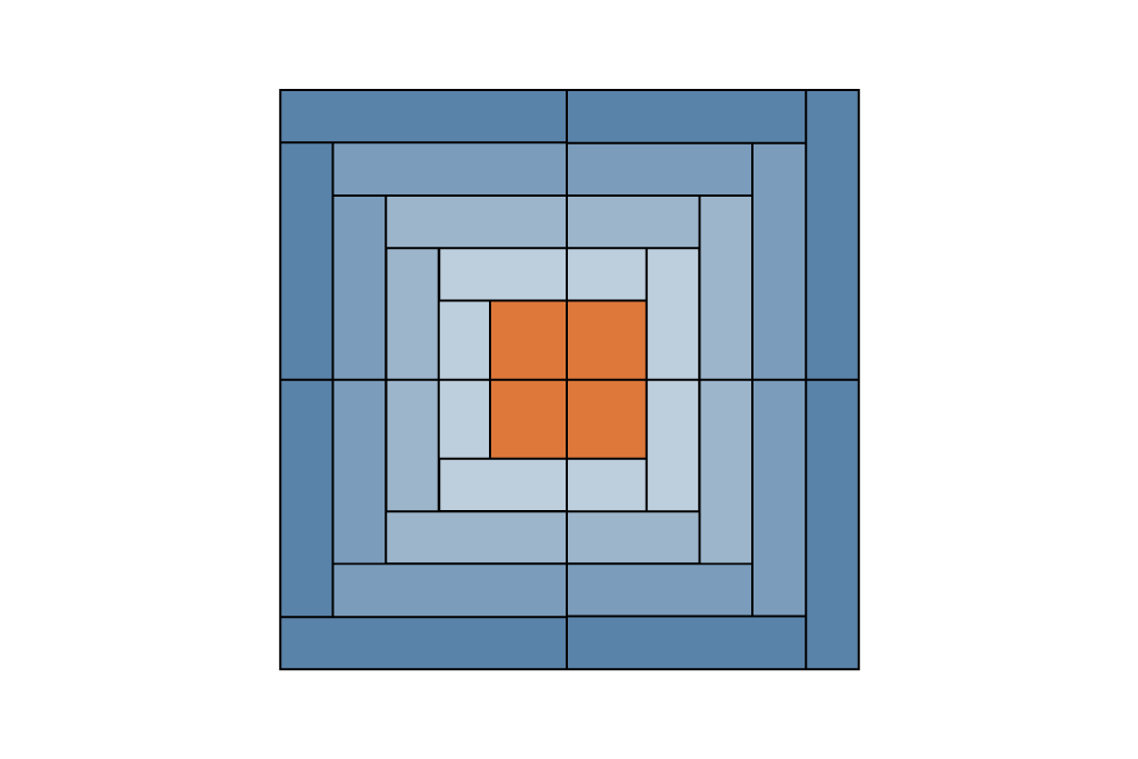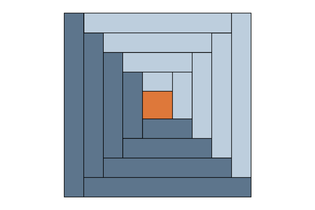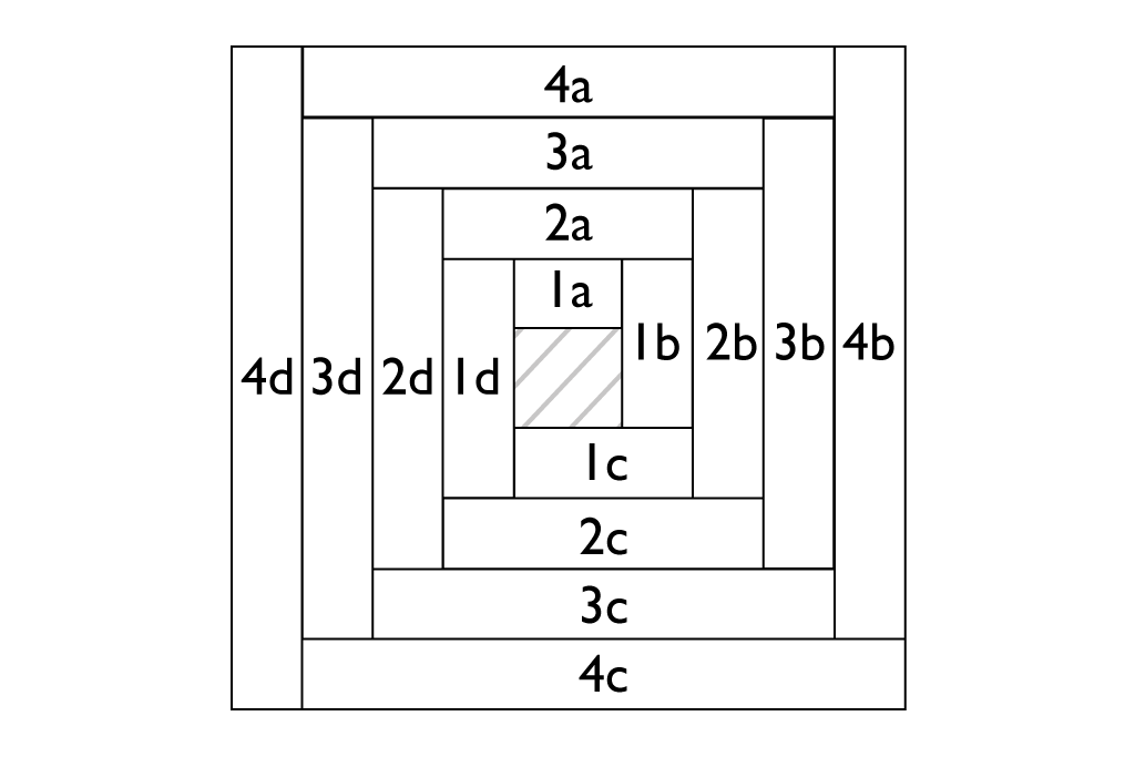 Aufbau des Blocks: Ein Log Cabin entsteht spiralförmig um die Mitte herum. Wir empfehlen vorher das Design / Farbanordnung entweder auf dem Papier zu skizzieren oder alternativ zugeschnittene Streifen anzuordnen und zu fotografieren, um dem Muster beim Nähen folgen zu können.