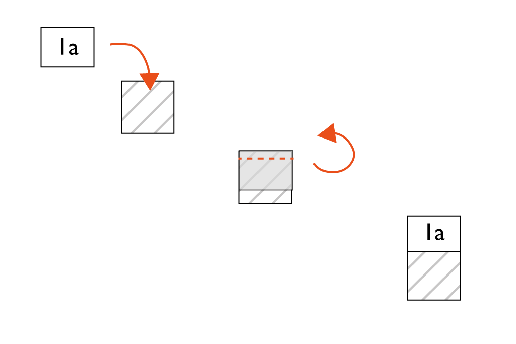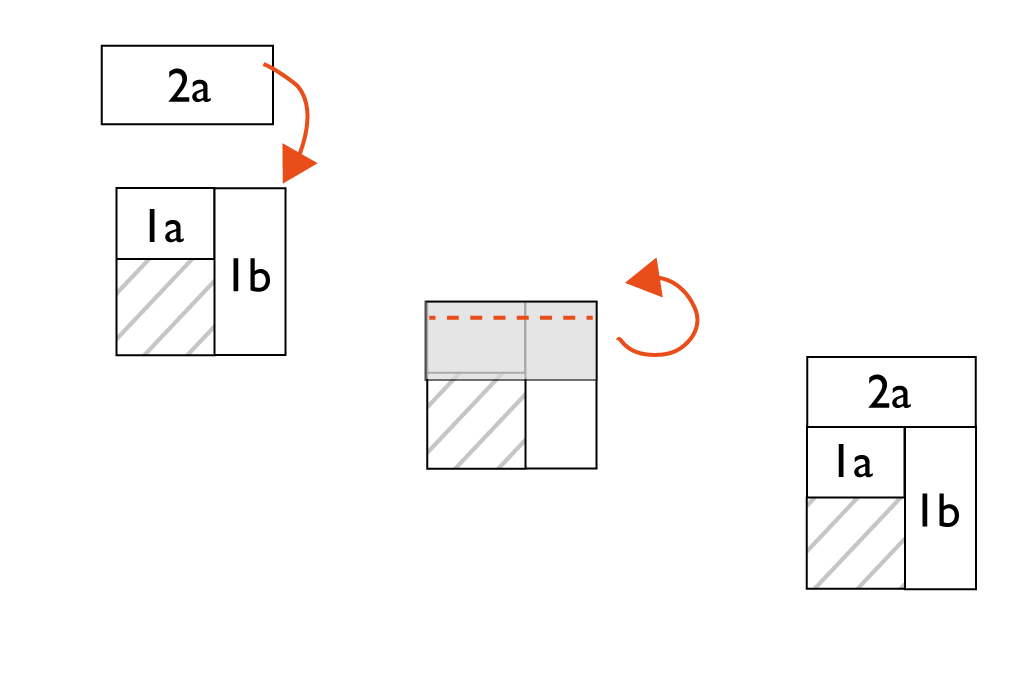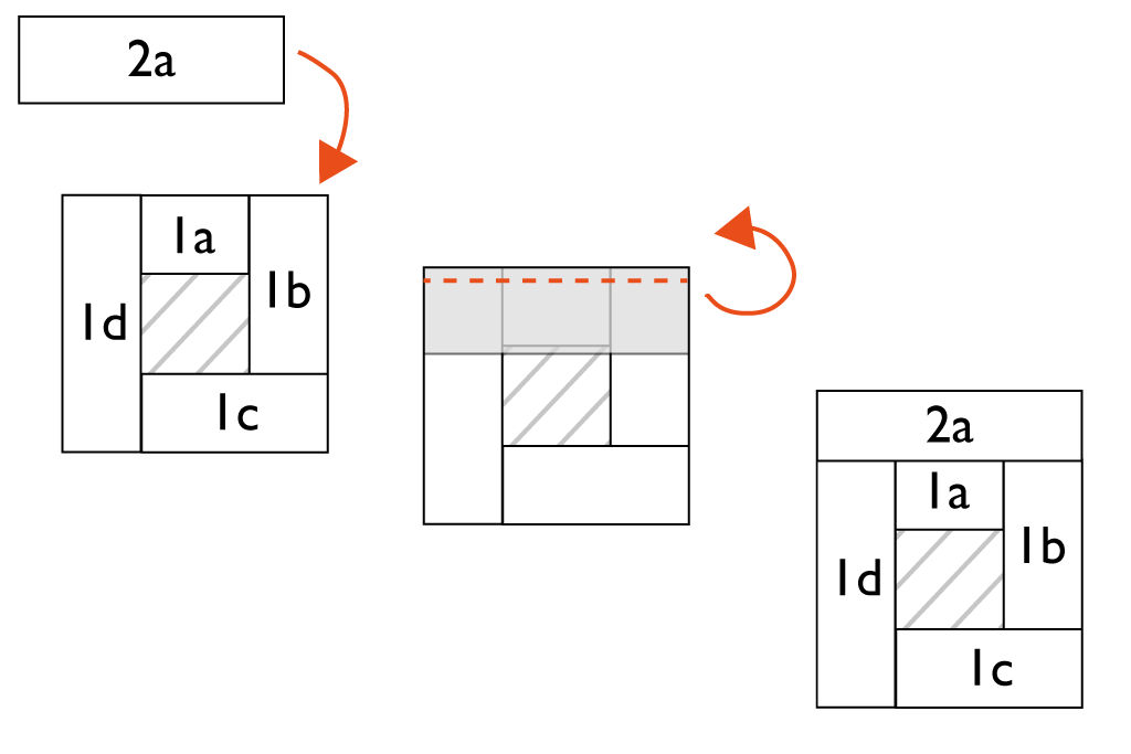 Es wird in halben Runden um das Quadrat genäht: das kurze Stück 1 a rechts auf rechts auf das Quadrat legen und mit 1cm Abstand zur Kante steppen. Aufklappen und bügeln. Anschließend Quadrat 1 b rechts auf rechts auf das bereits genähte Stück legen, wie im Bild gezeigt. Ebenfalls Absteppen, aufklappen und Nahtzugaben auseinanderbügeln.