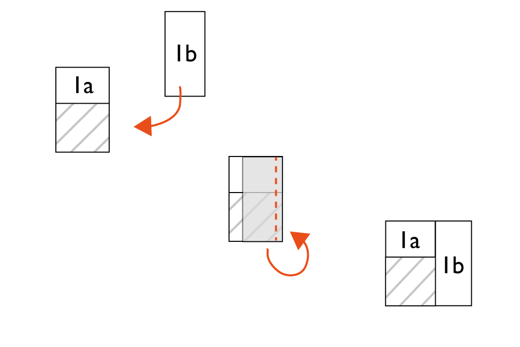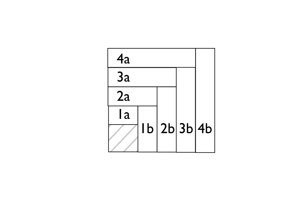Im nächsten Schritt das Rechteck 2 a rechts auf rechts auf die Kante von 1a und 1b legen und absteppen. Aufklappen und bügeln. Dann Rechteck rechts auf rechts auf Kante von 2a und 1b legen. Und wieder steppen, aufklappen und bügeln. Das ganze so lange wiederholen, bis alle geplanten Runden genäht sind.
