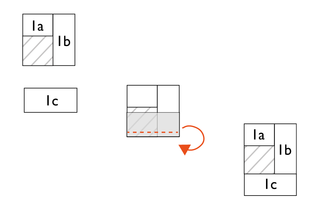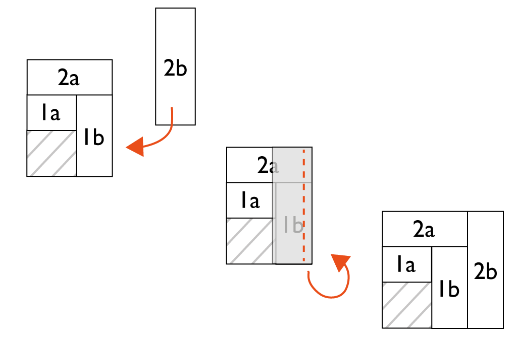 Das kurze Stück 1 a rechts auf rechts auf das Quadrat legen und mit 1cm Abstand zur Kante steppen. Aufklappen und bügeln. Anschließend Quadrat 1 b rechts auf rechts auf das bereits genähte Stück legen, wie im Bild gezeigt. Ebenfalls Absteppen, aufklappen und Nahtzugaben auseinanderbügeln.