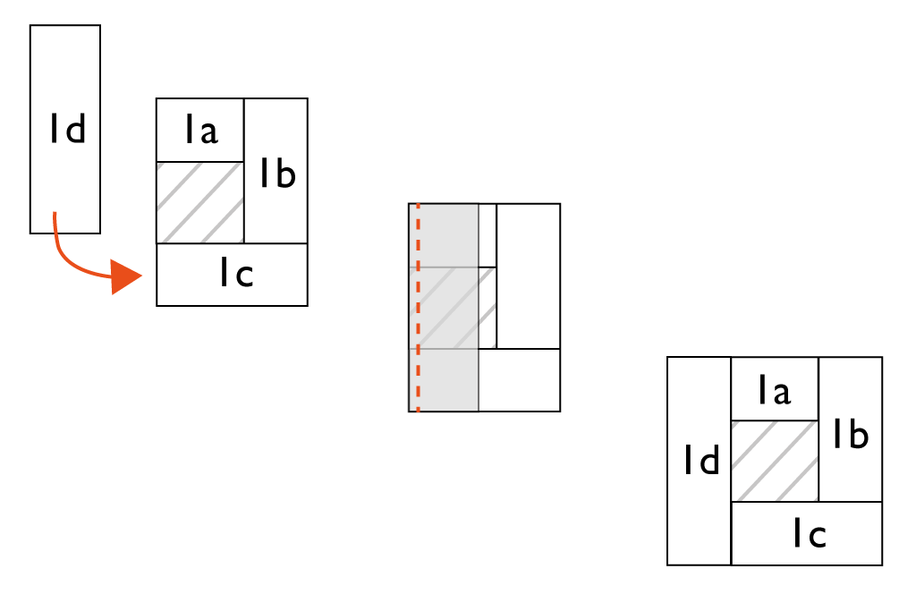 Streifen 1c rechts auf rechts auf die Kante Quadrat / kurze Seite 1 b legen und absteppen. Aufklappen, bügeln, evtl. auf Blockmaß zurückschneiden. Schnitteil 1d rechts auf rechts auf die letze Quadratkante und die schmalen Seiten von 1a und 1c legen, absteppen, aufklappen, bügeln, evtl. zurückschneiden. Dieses Prinzip so oft wiederholen, wie Runden für das Muster geplant wurden.