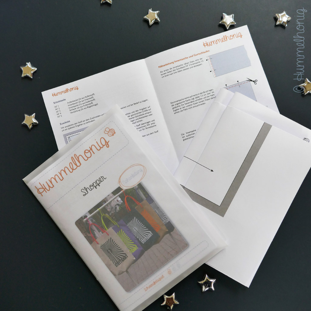 Den Shopper gibt es nicht nur als Freebook sondern mittlerweile auch in der Variante Papierschnitt. Dieser enthält neben dem großformatigen Schnittbogen auch die komplette Anleitung in gedruckter, handlicher Form – perfekt um während dem Nähen nicht die ganze Zeit ins Handy schauen zu müssen! Verpackt ist der Papierschnitt in einem halbtransparenten Papierumschlag, zur weiteren Aufbewahrung von Anleitung und Schnittmuster.