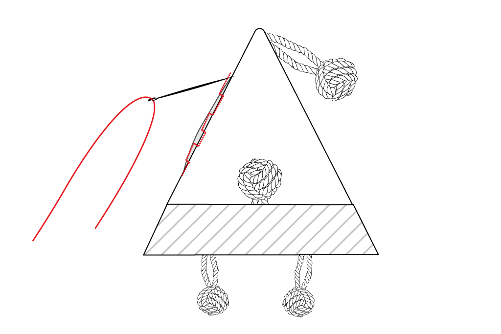 Die Kordelenden der zweiten Affenfaust auf ca. 12 cm kürzen. Die Kordelenden dieser Affenfaust auf der rechten Stoffseite an der oberen Ecke des Dreiecks feststecken und wie bei der ersten Affenfaust festnähen.