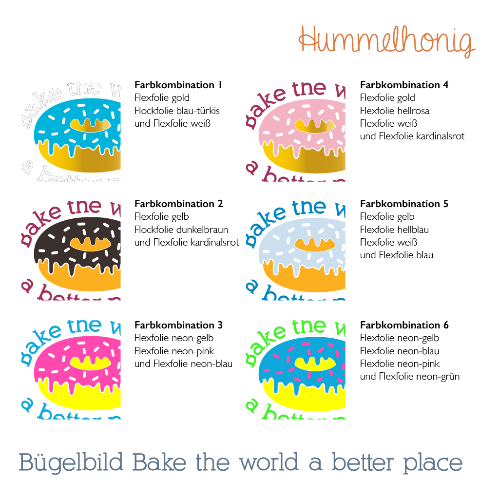 Dieses Bügelbild bieten wir dir einfarbig oder in 6 vordefinierten Farbkombinationen an. Bei den Kombinationen 1-3 sind die Streusel ausgeschnitten und die Farbe des Stoffs schaut durch. Die Kombinationen 4-6 enthalten die Streusel als zusätzliches Teil zum Aufbügeln. Wünschst du dir eine andere Farbkombination, als die von uns vorgegebenen, schreib uns gerne an!